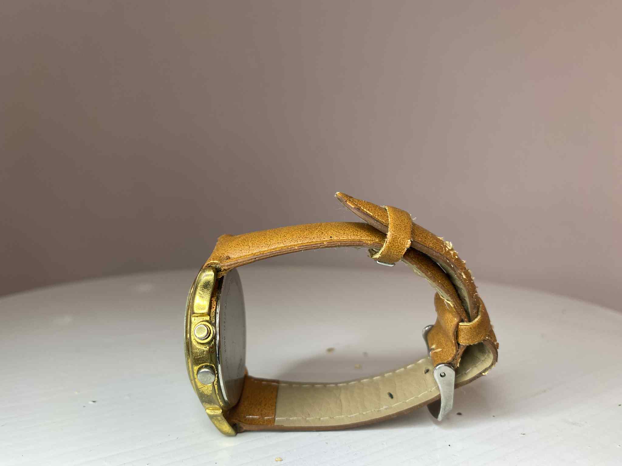Caja: Metálica dorada de aproximadamente 35 mm; muestra desgaste natural (pátina, rayones leves).