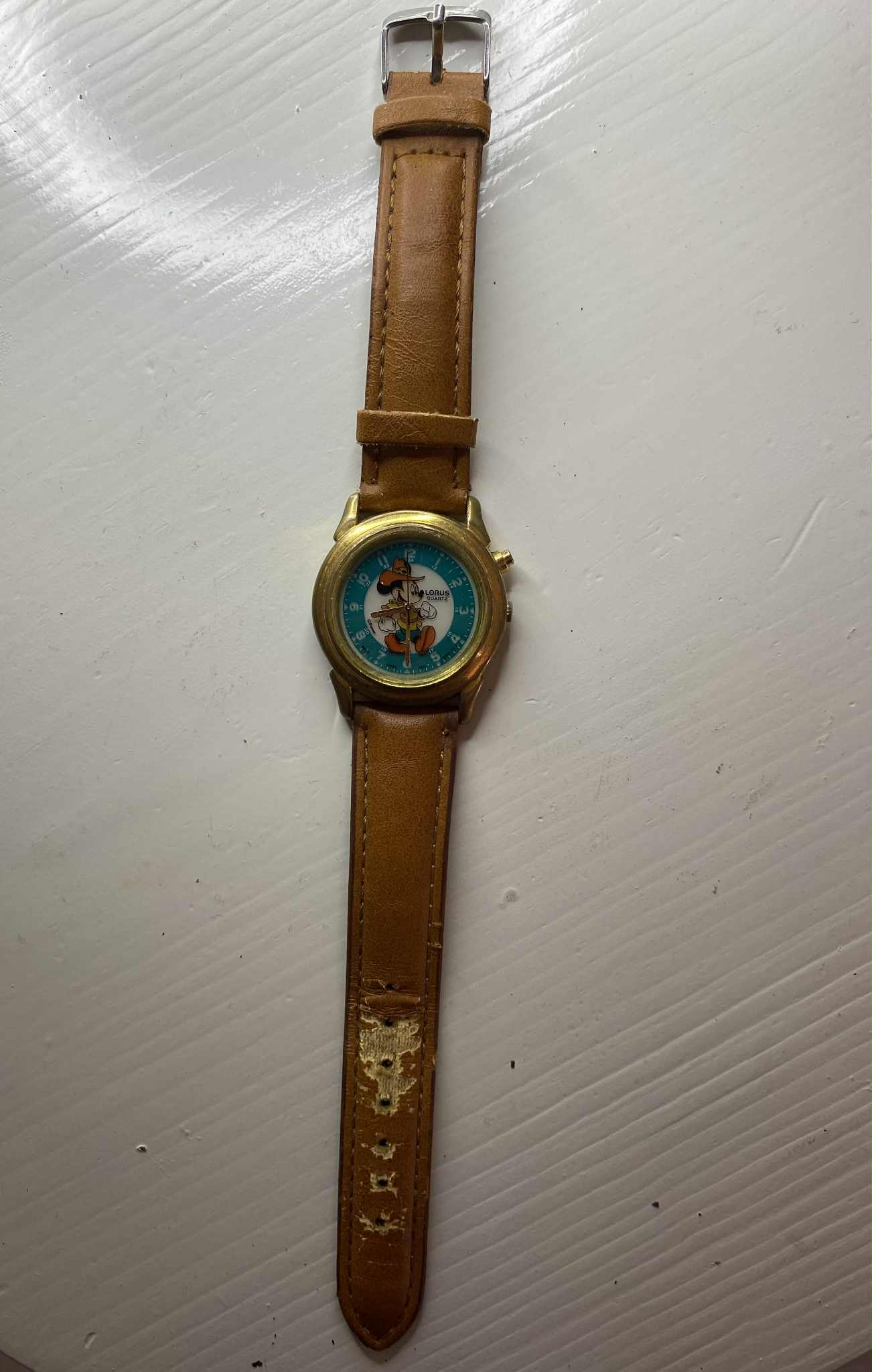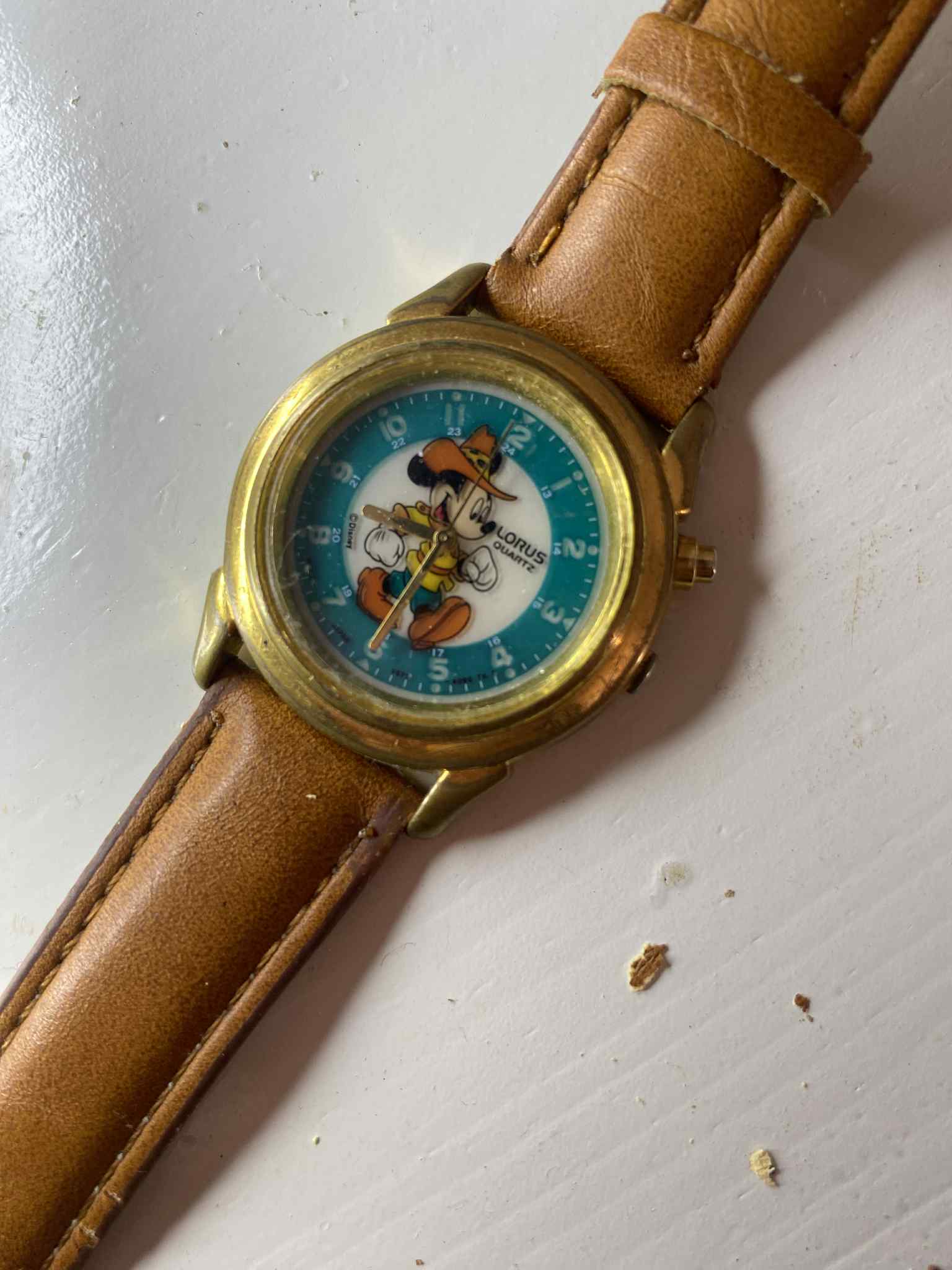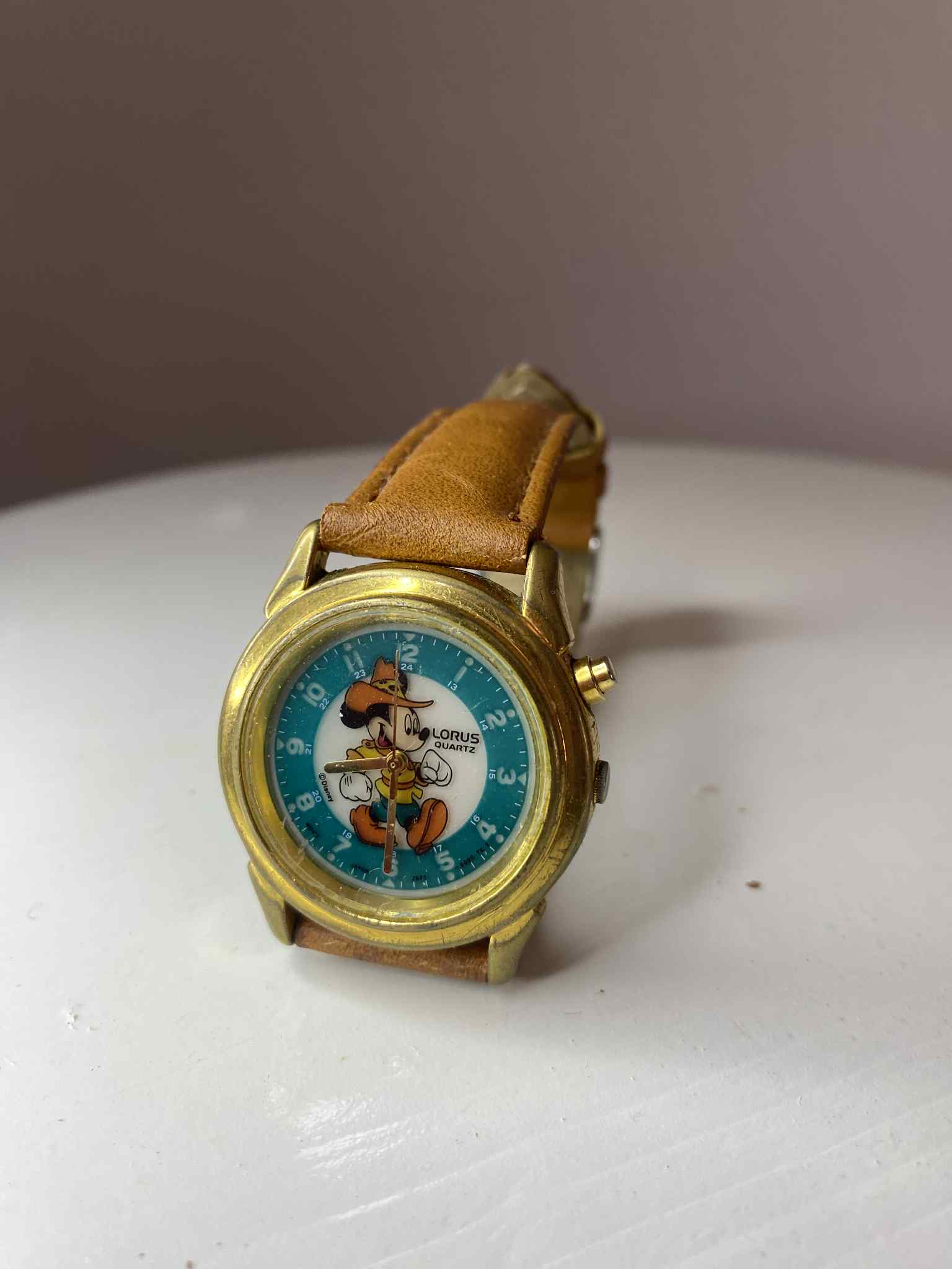 Reloj Lorus clásico con Mickey vestido de vaquero en esfera turquesa. Caja metálica dorada (~35 mm) con pátina vintage. Necesita pila y la correa de cuero marrón no es original. Pieza ideal para fans vintage de Disney.