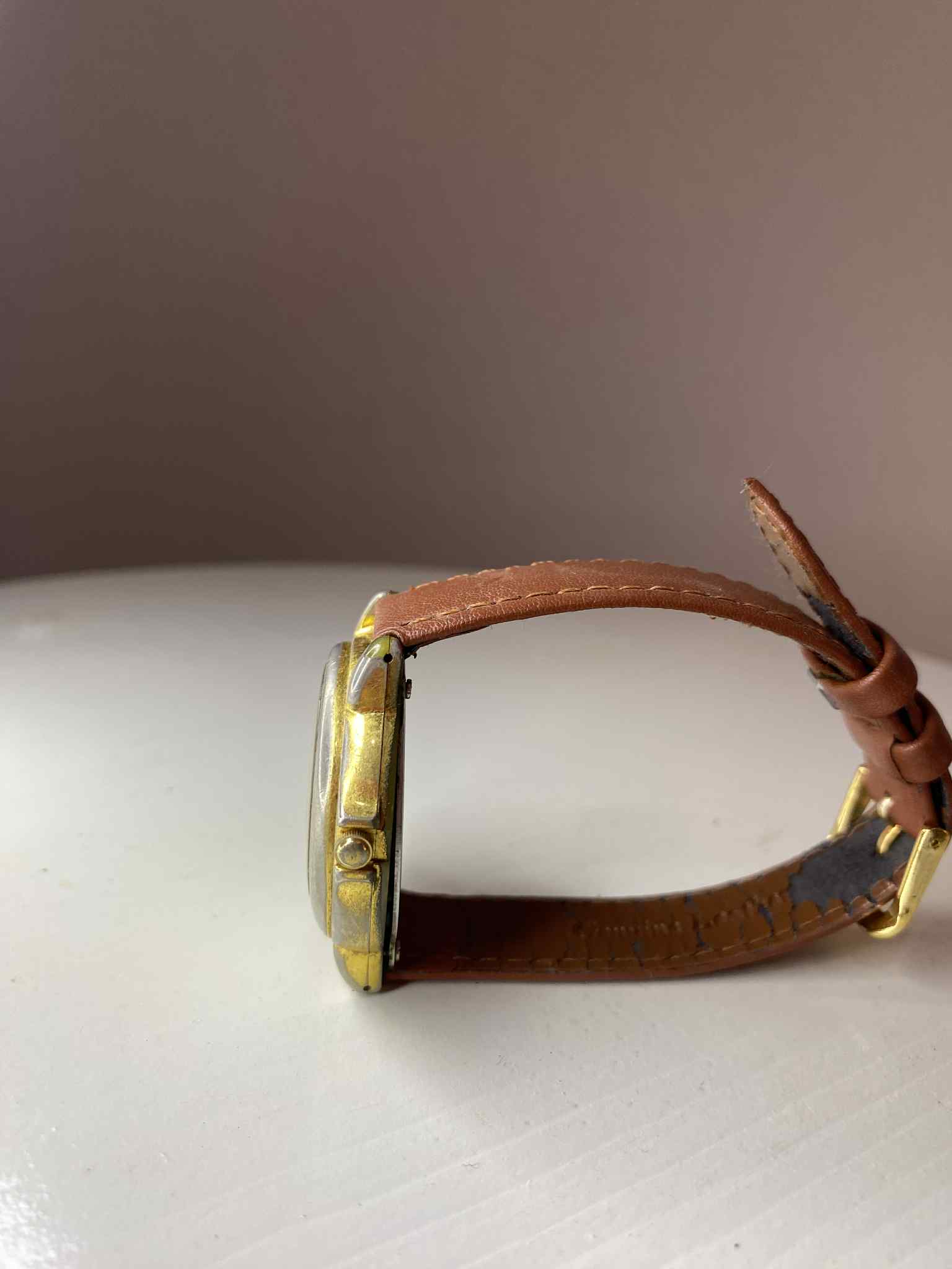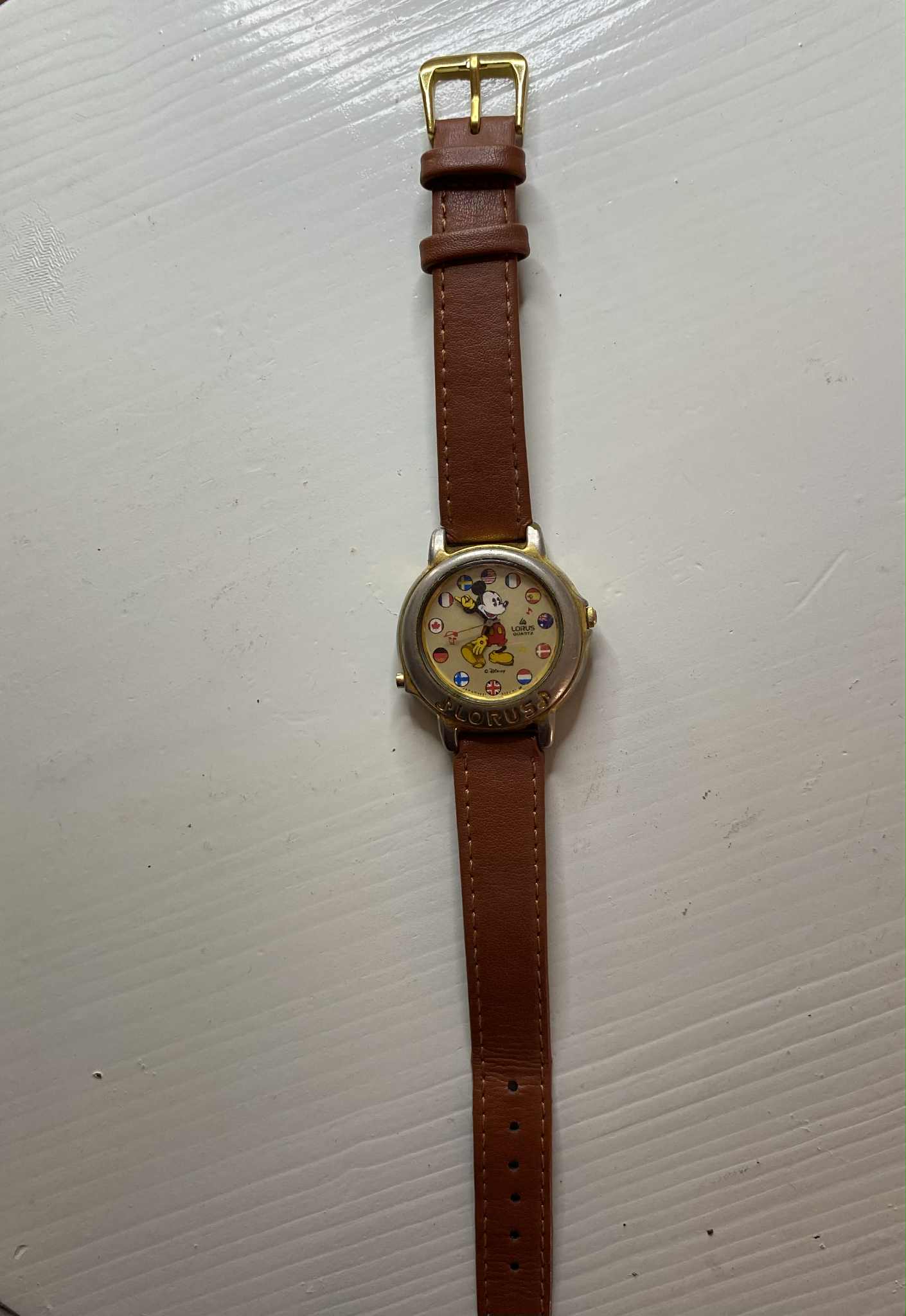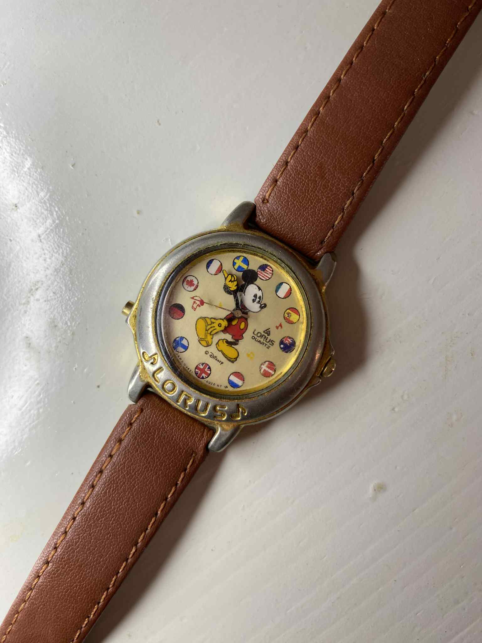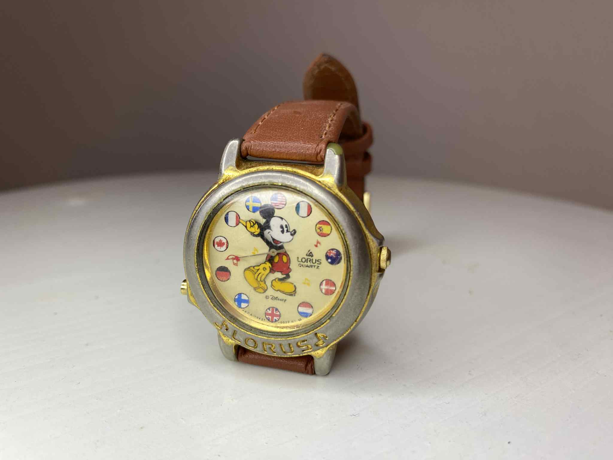 Reloj clásico de Lorus (Seiko) con esfera dorada y Mickey en el centro rodeado de banderitas. Movimiento de cuarzo, necesita pila nueva. La caja metálica muestra desgaste leve que le da carácter. Incluye correa de cuero marrón (no original).